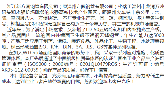 浙江新方圓鋼管專業(yè)生產(chǎn)TP316L不銹鋼無縫圓管、方矩管,高品質(zhì)換熱器管 |